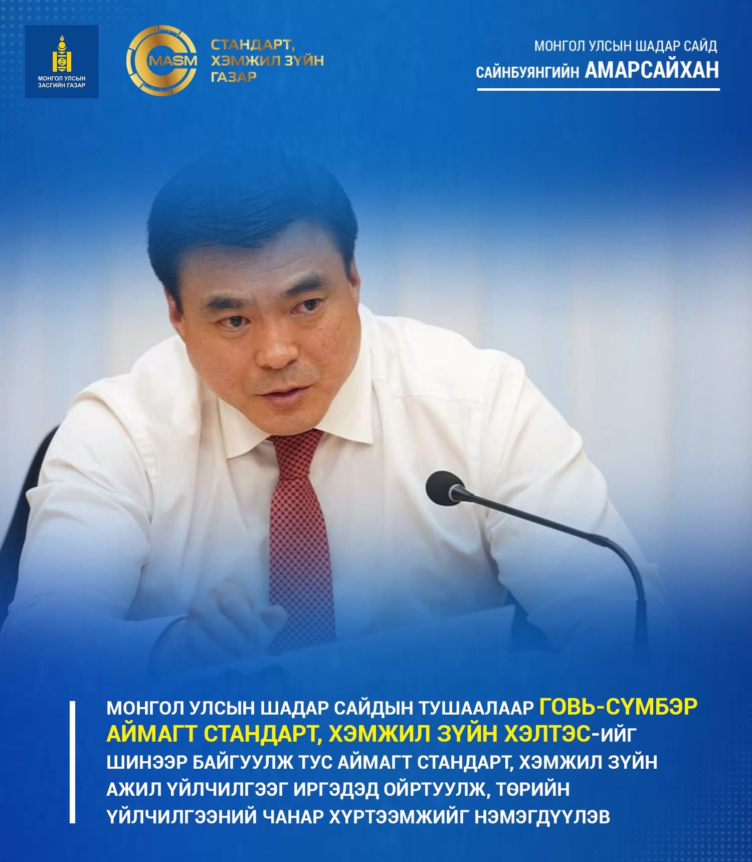 Монгол Улсын шадар сайдын тушаалаар говь-сүмбэр аймагт стандарт, хэмжил зүйн хэлтсийг шинээр байгуулж тус аймагт стандарт, хэмжил зүйн ажил үйлчилгээг иргэдэд ойртуулж, төрийн үйлчилгээний чанар хүртээмжийг нэмэгдүүлэв.