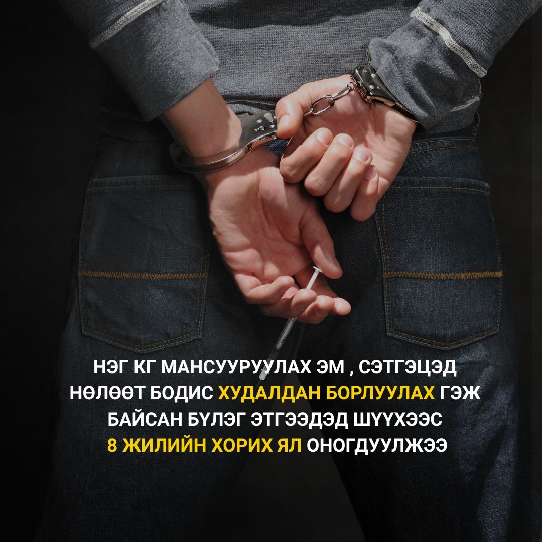 Шалгалтаар 30-35 насны бүлэг этгээд метамфетамины агууламжтай “мөс” гэх бодисоос 1 килограммыг нуун далдалж, улсын хилээр хууль бусаар нэвтрүүлсэн хэрэгт мөрдөн шалгах ажиллагаа явуулж, шүүхээс 8 жилийн хорих ял оногдуулжээ