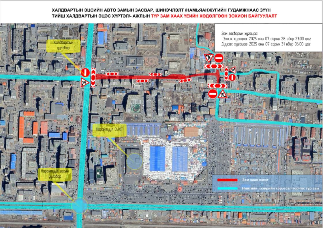 Халдвартын эцсийн авто замын засвар, шинэчлэлтийн ажлын хүрээнд Намьянжугийн гудамжнаас зүүн тийш Халдвартын эцэс хүртэлх авто замыг хааж засвар, шинэчлэлтийн ажил хийж гүйцэтгэнэ.