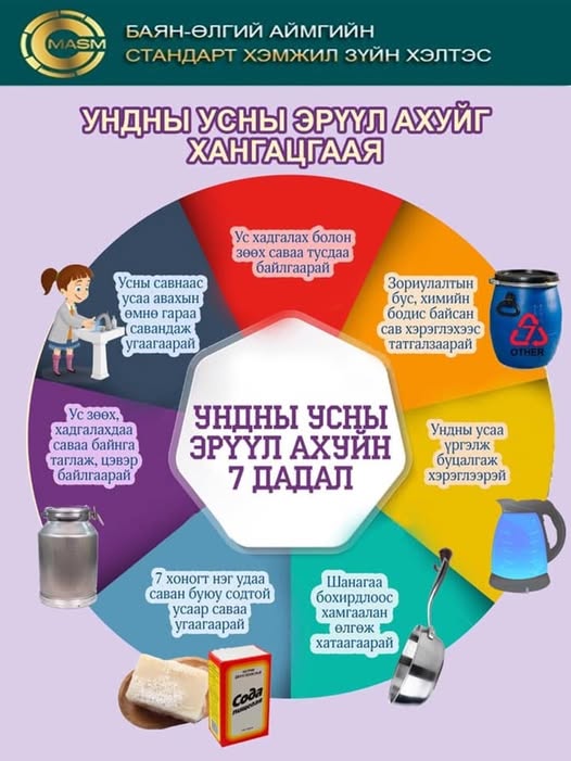 Эрүүл ахуйн шаардлага хангасан ундны ус хэрэглэж хэвшицгээе. Ундны ус. Эрүүл ахуйн шаардлага, чанар, аюулгүй байдлын үнэлгээ MNS 0900:2018 Дэлгэрэнгүй мэдээллийг доорх линкээс харна уу.