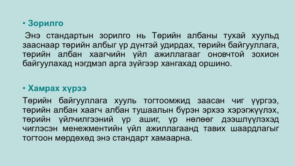 “Төрийн албаны үйл ажиллагаанд тавих ерөнхий шаардлага” MNS 7068:2025 Тус стандартыг мөрдөж, хэвшихийг нийт төрийн байгууллага болон албан хаагчдад уриалж байна.
