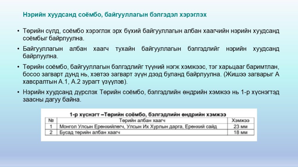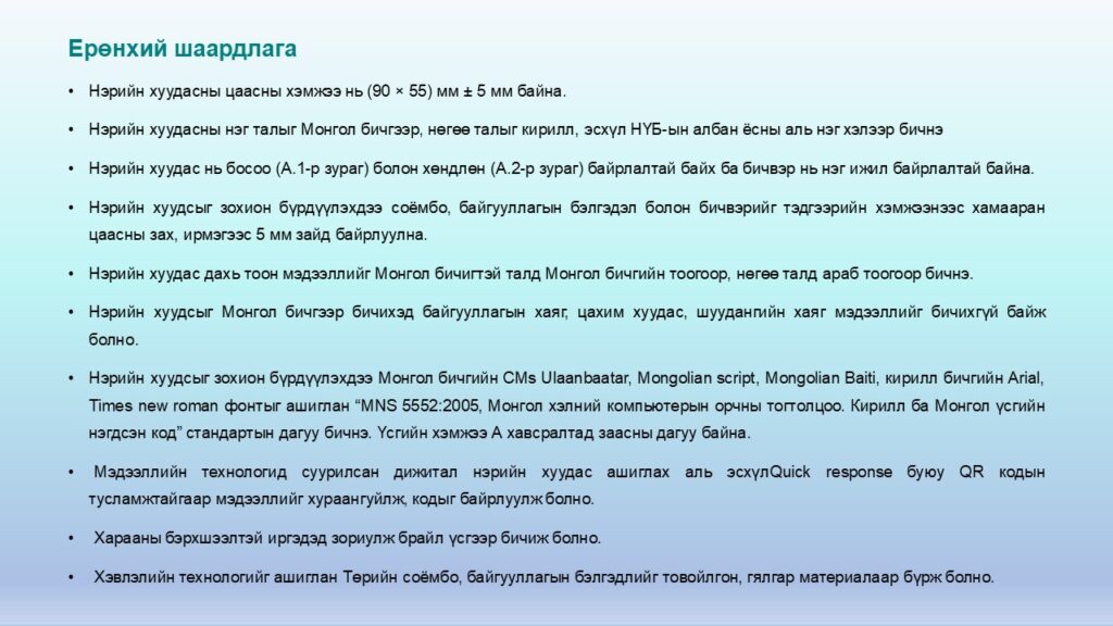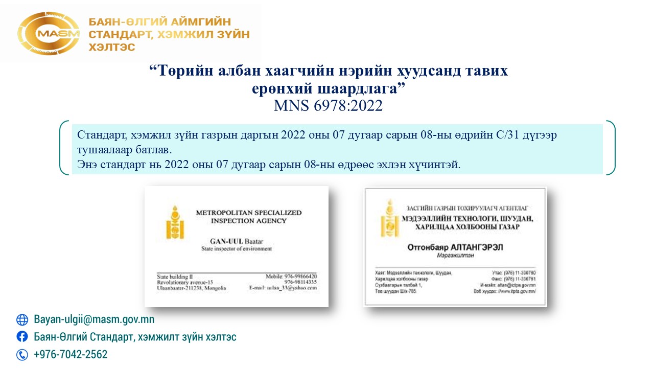 Энэ стандарт нь 2022 оны 07 дугаар сарын 08-ны өдрөөс эхлэн хүчинтэй.�Стандартын дэлгэрэнгүйг үзэх бол https://estandard.gov.mn/website/home.aspx�Стандартыг татаж авах бол https://e-mongolia.mn/service/standartyn-tsakhim-san холбоос дарна уу.