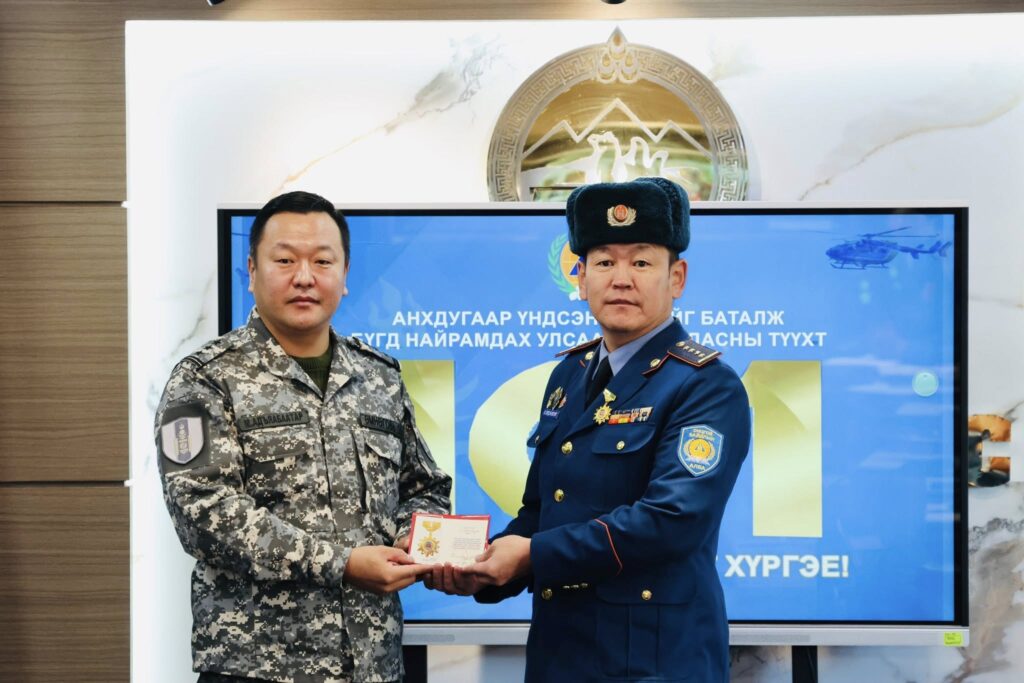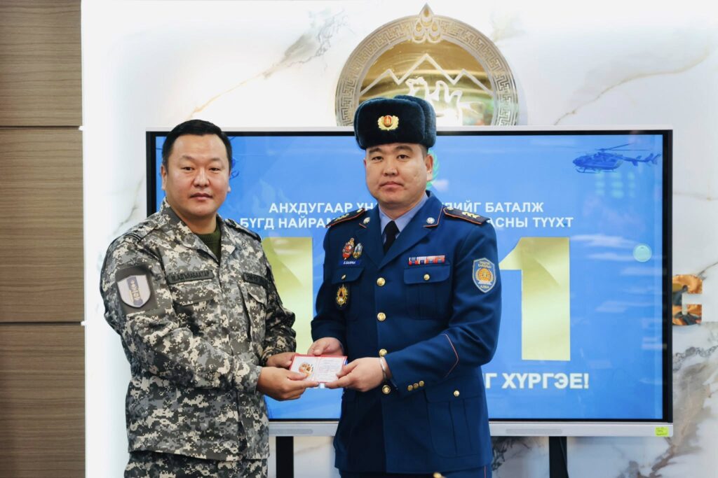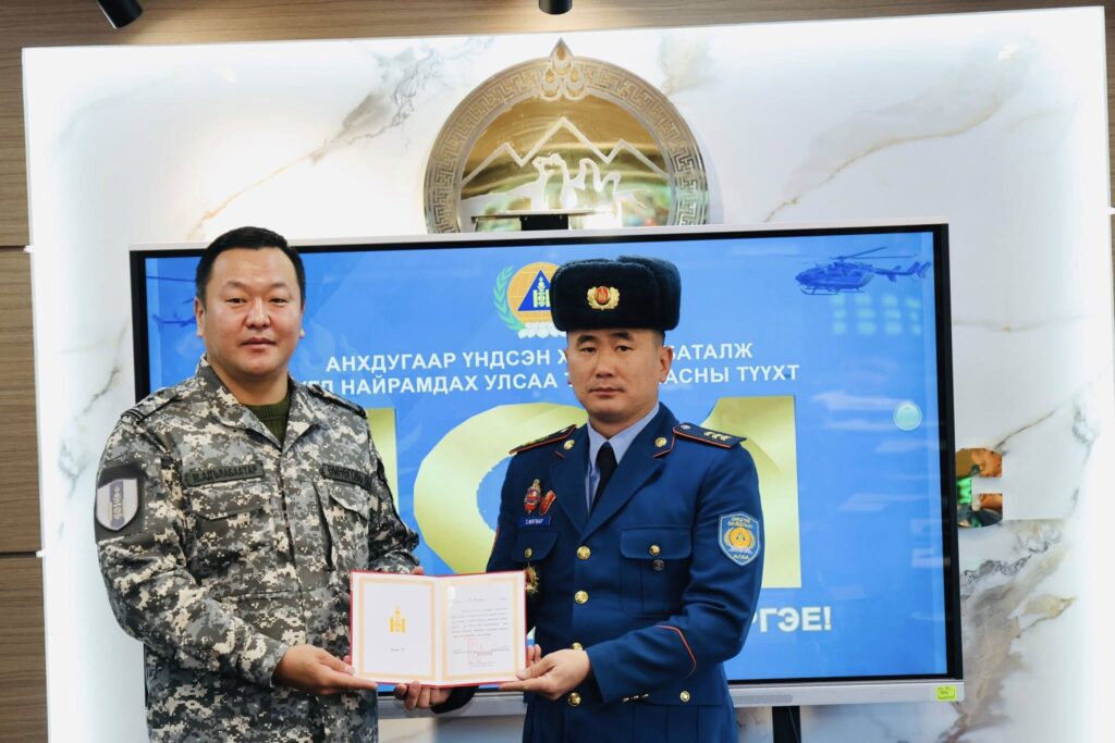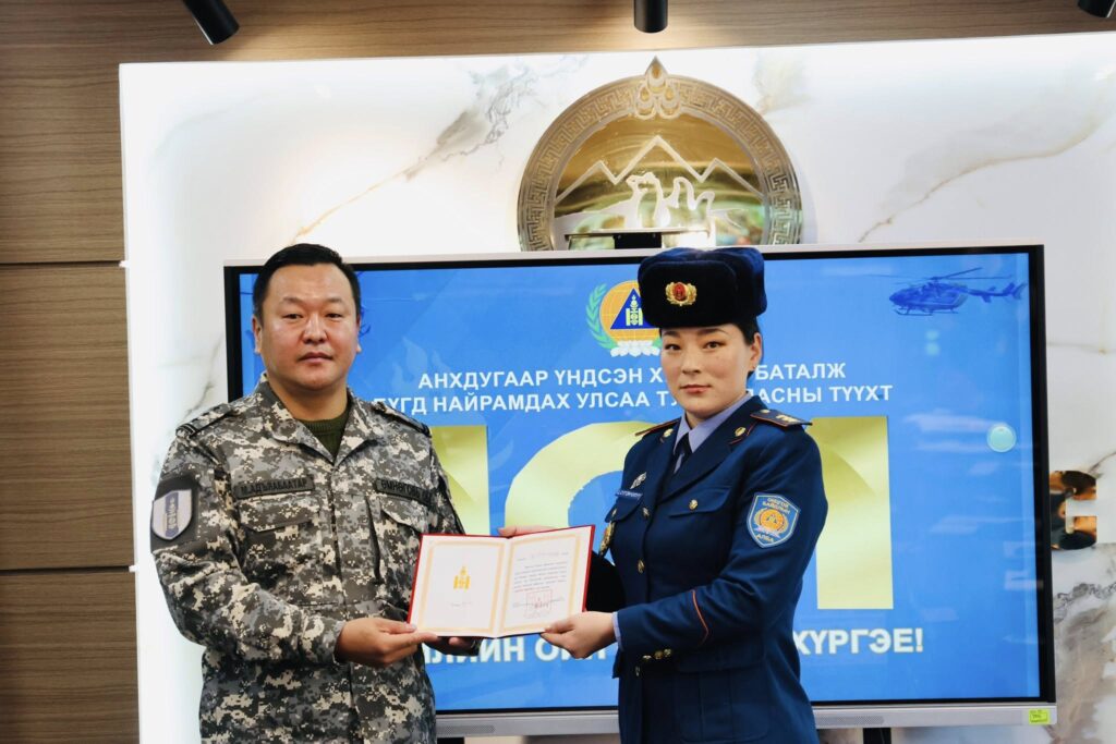 Бүгд Найрамдах Улс тунхагласны 101 жилийн ойг тохиолдуулан эрхэлсэн ажилдаа үр бүтээл гаргаж, хамт олноо манлайлан ажилласан Өмнөговь аймгийн Онцгой байдлын газрын зарим алба хаагчдад цол олгож, Онцгой байдлын ерөнхий газрын даргын шагналаар шагнаж урамшууллаа.